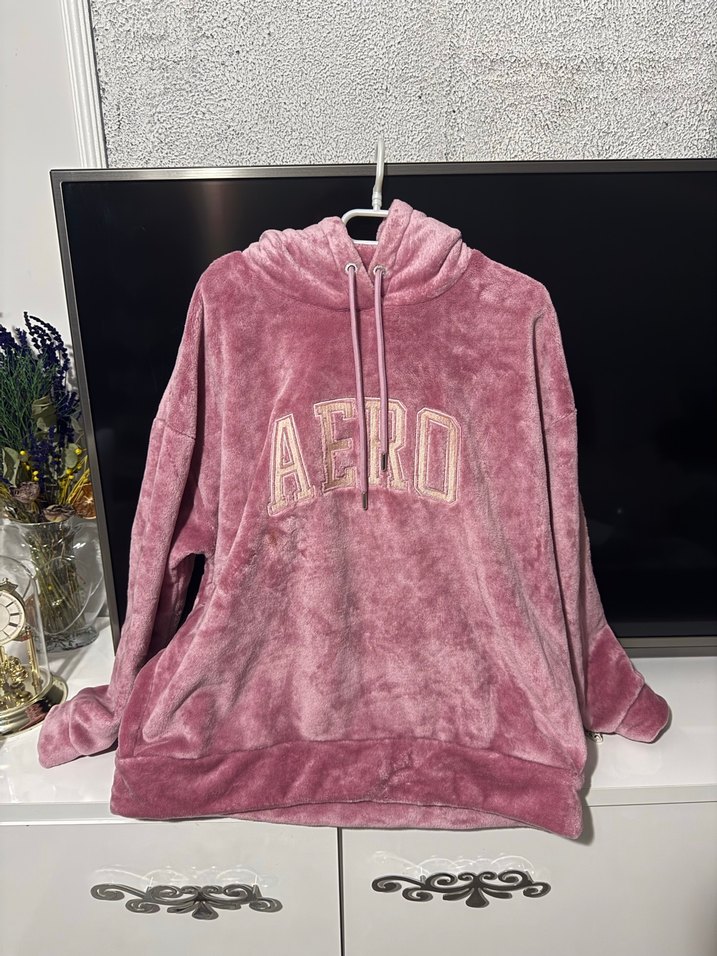 Pembe kapüşonlu sweatshirt, bol kesim, yumuşak ve sıcak kumaş, kürk detaylı kapüşon, uzun kollu, normal boy ve pastel renkli batik desenli.