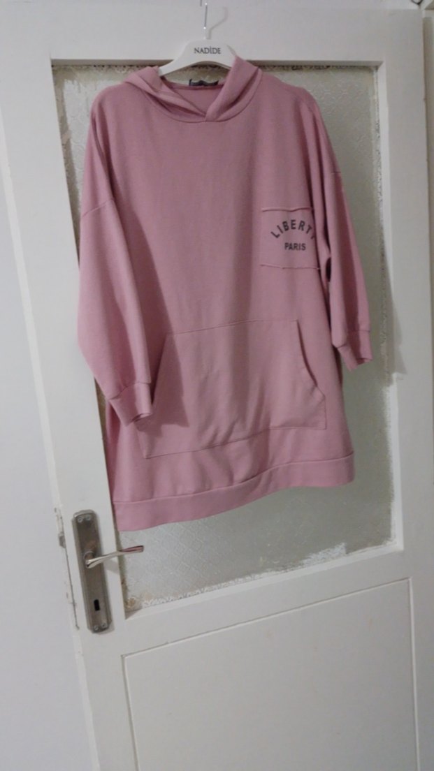 Pembe kapüşonlu, uzun kollu, bol kesim kadın sweatshirt. Yumuşak ve sıcak kumaştan, LIBERTY PARIS baskılı detaylı. Rahat kullanım için ideal.