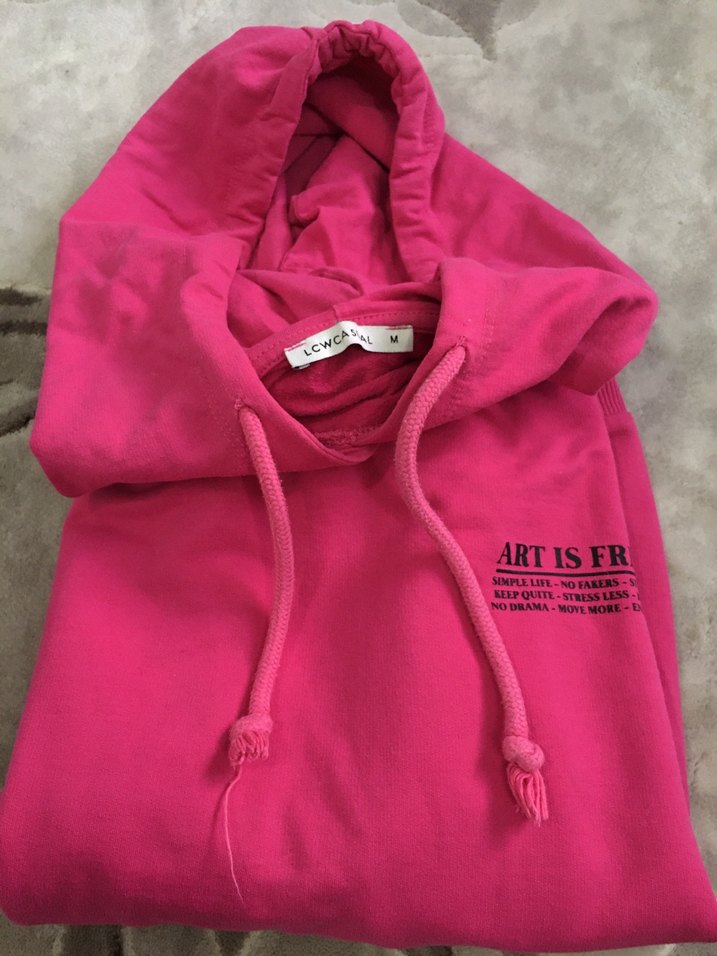 Pembe kapüşonlu, uzun kollu ve renkli baskılı, yumuşak ve sıcak kumaştan yapılmış, rahat ve şık kesim kadın sweatshirtü. Önünde "ART IS FR" yazısı bulunur.