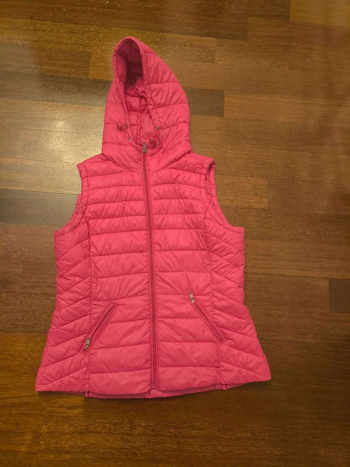 Fermuarlı cepleri ve kapüşonu olan, yüksek yakalı, pembe renkli, yumuşak ve sıcak kumaştan yapılmış, dar kesim kadın yeleği. Rahat sokak stiline uygundur. İki koltukaltı arası 50 cm.Omuzdan etekucuna 59 cmEnson resimde görünen arka bel kısmında bi gırilik var.