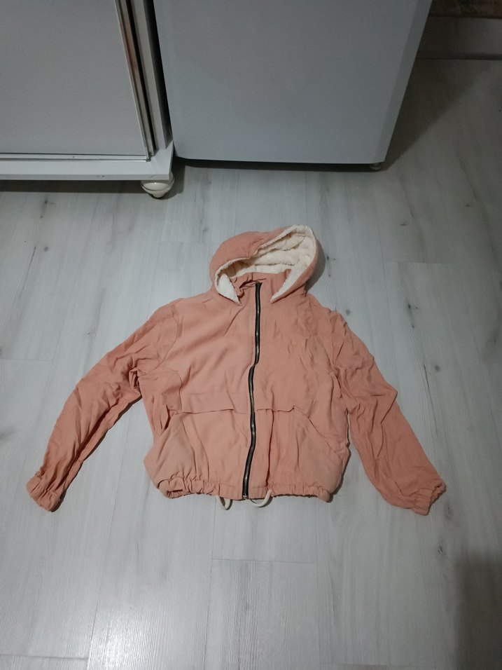 Bu kadın ceketi kapüşonlu, uzun kollu ve önden fermuarlıdır. Yumuşak ve sıcak dokusuyla pastel pembe renkte, rahat kullanıma uygundur.