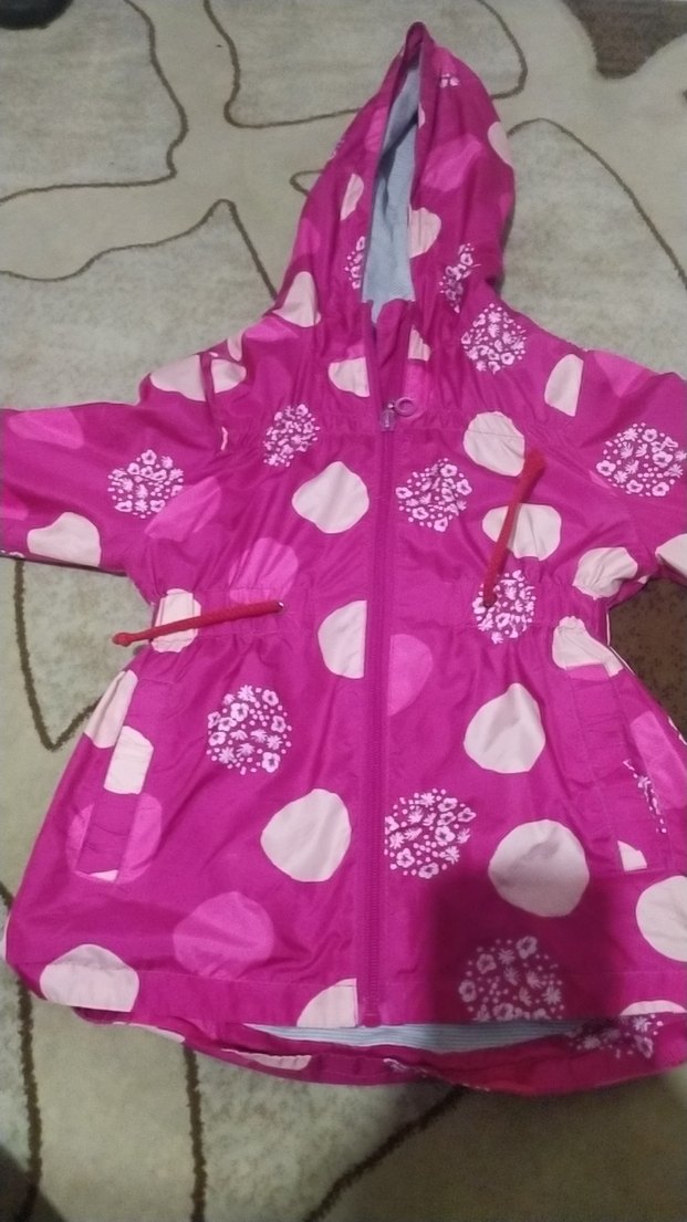 Pembe renkli baskılı, kapüşonlu kız çocuk montu. Sentetik kumaştan, bol kesim ve fırfır detaylı, sokak modasına uygun.sifir gibi hiç sorunu yoktur
