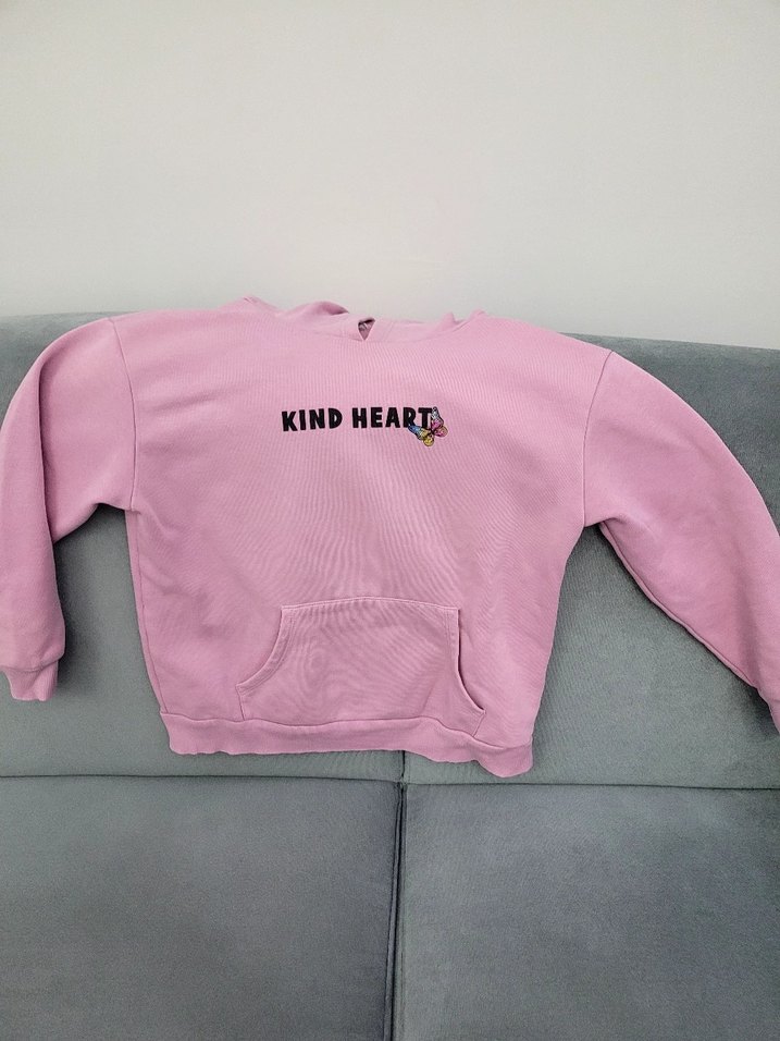 Pembe kapüşonlu, uzun kollu, bol kesim ve yumuşak dokulu kız çocuk sweatshirt. "KIND HEART" baskılı ve ön cepli. Rahat sokak stili için uygun.