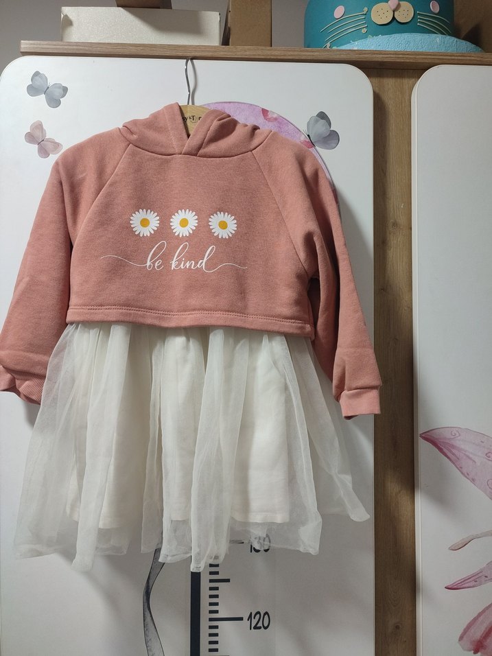 Pembe kapüşonlu kız elbisesi, uzun kollu ve bol kesimdir. Fleece üst kısmında "be kind" yazılı papatya baskısı ve tül etek bulunur. Trendy ve rahat görünüme uygundur.