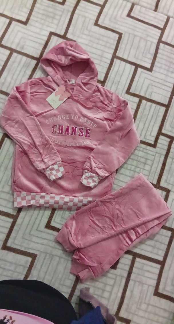 Pastel pembe kapüşonlu ve baskılı polar kumaştan yapılmış bol kesim kız eşofman takımıdır. Uzun kollu ve kareli manşet detaylarıyla rahat ve şık bir sokak stili sunar.