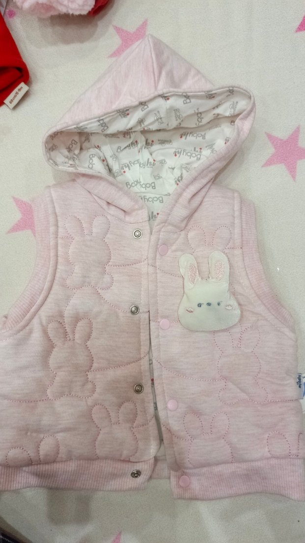 Pembe kapüşonlu, düğmeli kız yeleği, nakışlı tavşan desenleri ve fitted kesimi ile rahat bir seçenek sunar.