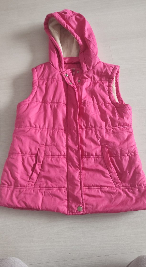 Pembe renkte kapüşonlu kız yeleği, düğmeli ve straplez yakalıdır. Rahat ve sıcak kumaştan, fit kesimlidir. 15-16 YAŞ YAZIYOR AMA 11-12 YAŞA UYGUN