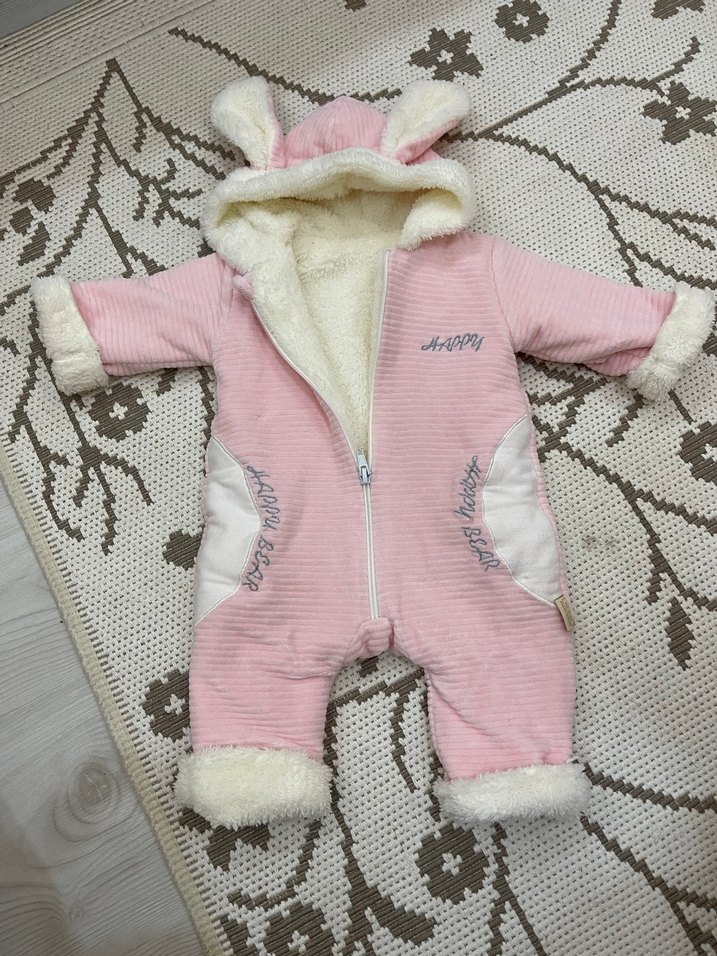 pembe renkte, kulaklı kapüşonlu, içi ve manşetleri kürklü bebek tulumu. Önden fermuarlı, kolay giyilir. 0-3 ay içindir 3-5 kere giyildi. Temizdir hiç kusuru yoktur