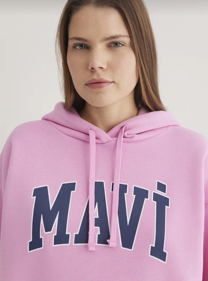 Yumuşak ve sıcak kumaştan, kapüşonlu ve uzun kollu, bol kesim pastel pembe sweatshirt. Önünde baskılı "MAVI" yazısı bulunur.