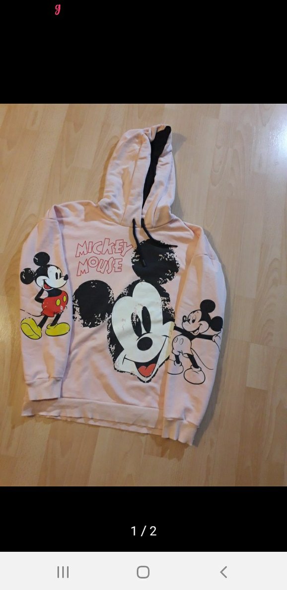 Bu pastel pembe kapüşonlu sweatshirt, bol kesim ve uzun kolludur. Yumuşak ve sıcak kumaş üzerine baskılı Mickey Mouse desenleri bulunur.