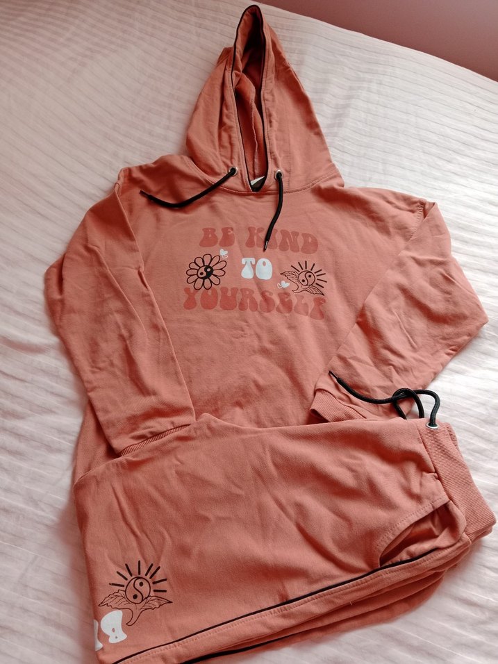 Pastel pembe kapüşonlu sweatshirt, bol kesim ve uzun kollu. Baskılı, fermuarlı detaylı, yumuşak ve sıcak kumaştan üretilmiştir. "BE KIND TO YOURSELF" yazılı desenli.