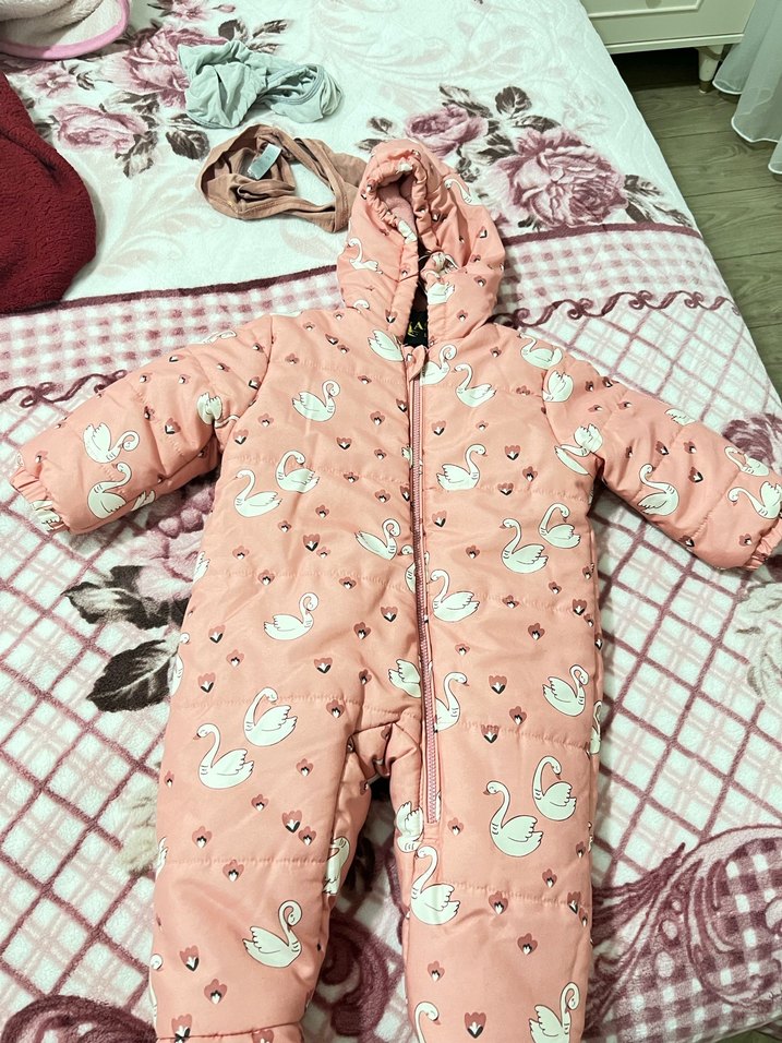 Kapüşonlu ve fermuarlı, pembe pastel renkte, kuğu nakışlı bebek tulumu. Yumuşak ve sıcak tutar, soğuk havalar için uygundur.