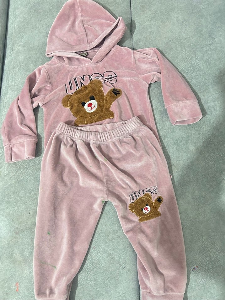 Pastel pembe yumuşak kumaştan, kapüşonlu ve uzun kollu bebek kıyafeti seti. Nakışlı ayı figürleri ve kürk detaylarıyla süslenmiştir. Defo vs yok iyi bir kumaşı var sadece alt tarafında keçeli kalem gibi bir lekesi var belki çıkarılabilir. Fiyata yansıtılmıştır.