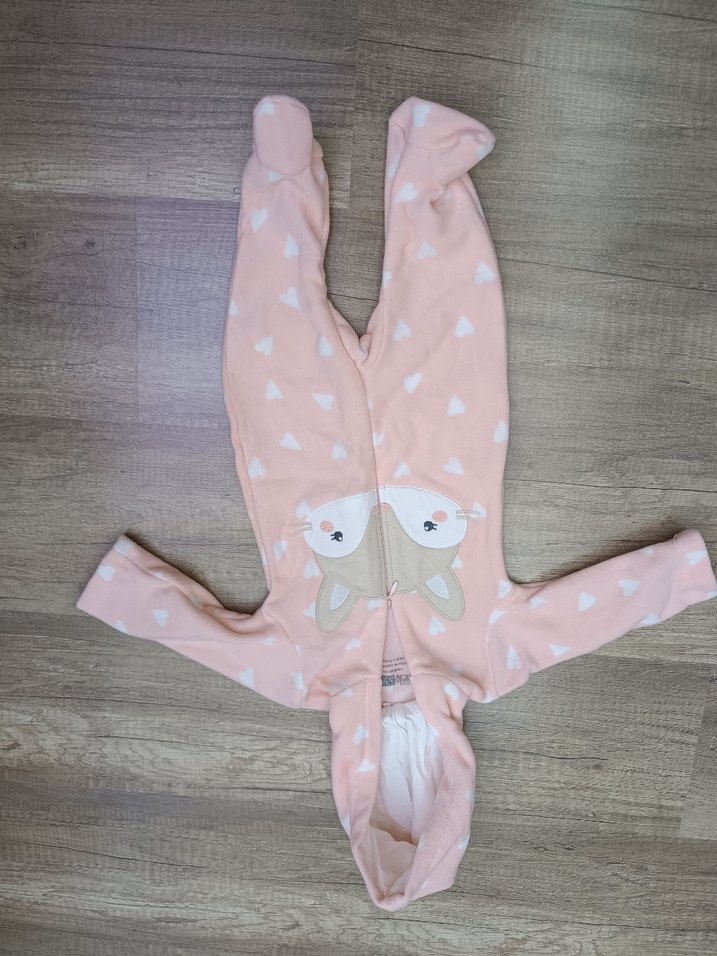Pastel pembe renkte, kapüşonlu ve ayaklı, örgü kumaştan yapılmış baskılı bebek tulumu. Önünde sevimli hayvan yüzü detayı bulunur.