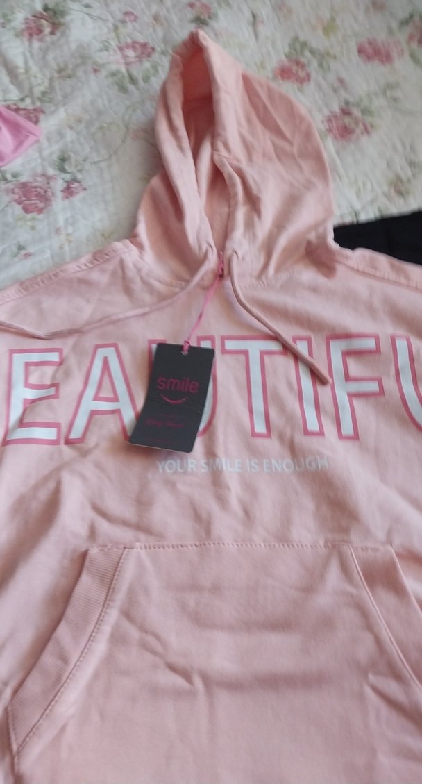 Pembe kapüşonlu elbise, bol kesim ve . Uzun kollu, baskılı "EATIF" yazılı, rahat sokak stili için uygundur.