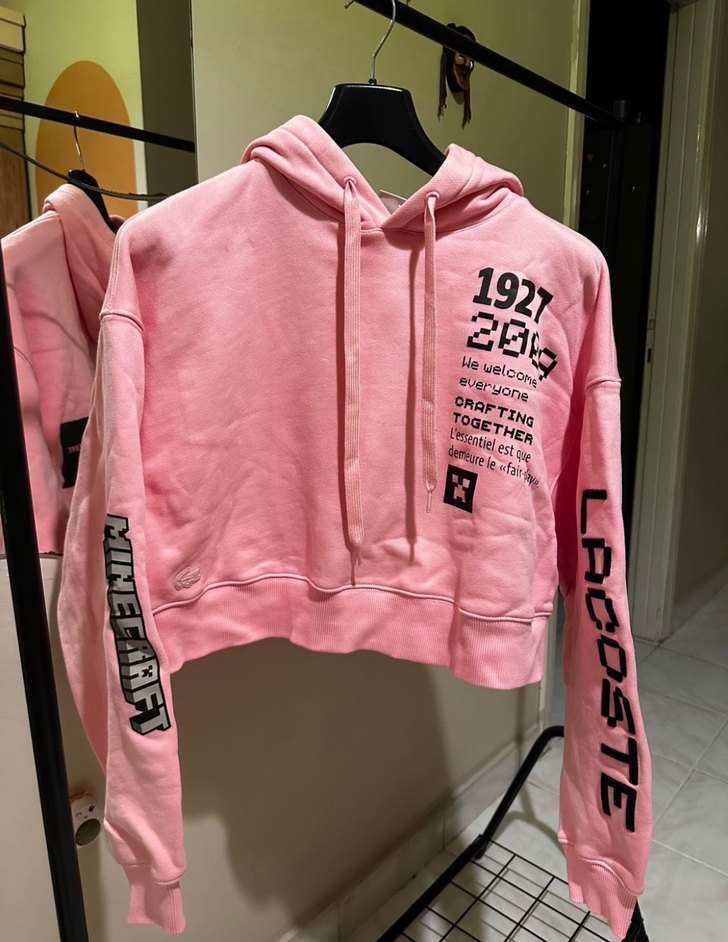 Yumuşak polar kumaştan, uzun kollu, kapüşonlu ve bol kesim pembe sweatshirt. Baskılı yazılar ve fermuarlı detaylar içerir. Rahat sokak stili için uygun.