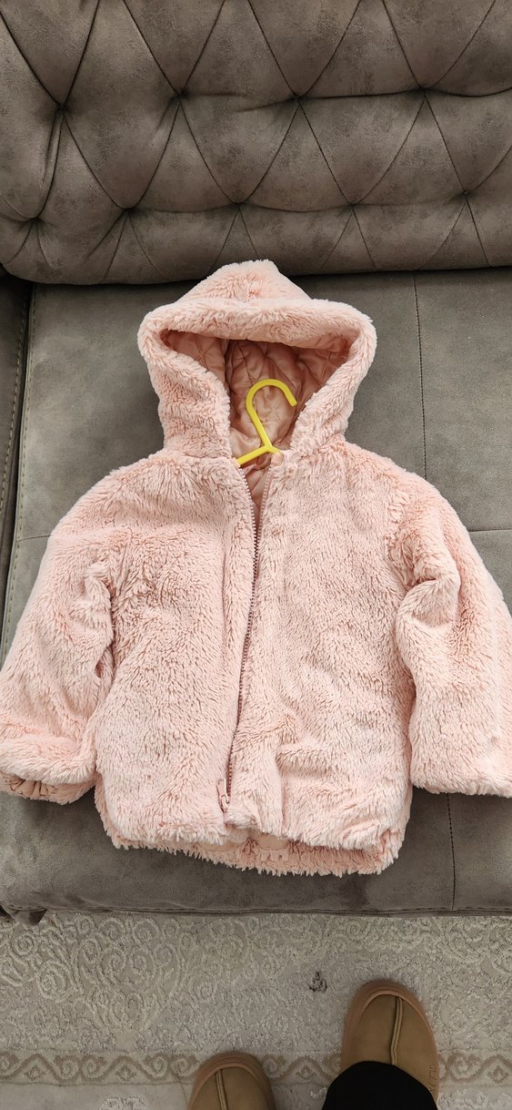 Pembe kapüşonlu kız çocuk mont, yumuşak peluş dokusu ve bol kesimi ile sıcak tutar. Düz pastel tasarımıyla sade ve rahat bir stil sunar. cok az temiz kullanildi