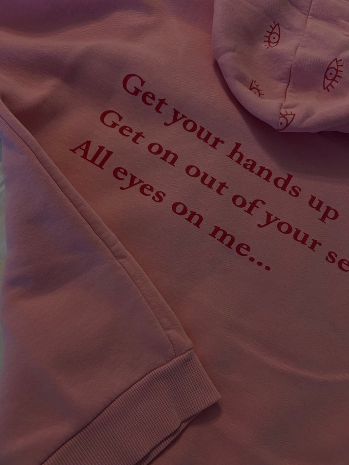 Pastel pembe renkli, kapüşonlu ve uzun kollu bu sweatshirt, rahat kesimi ve yumuşak kumaşıyla konfor sunar. Kollarda ve kapüşonda küçük göz desenleri bulunur.