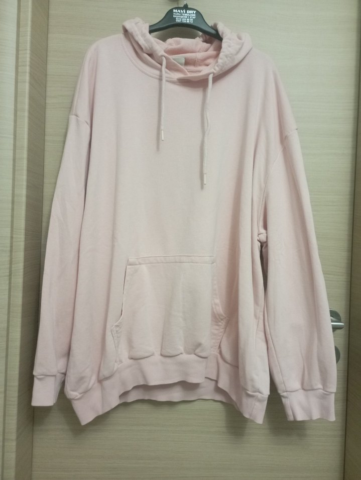 Pastel pembe renkli, uzun kollu, bisiklet yaka ve rahat kesim sweatshirt. Yumuşak ve sıcak kumaştan, kanguru cepli ve kapüşonlu, günlük rahat kullanım için uygun. 4XL bedene de olur geniş kalıptır