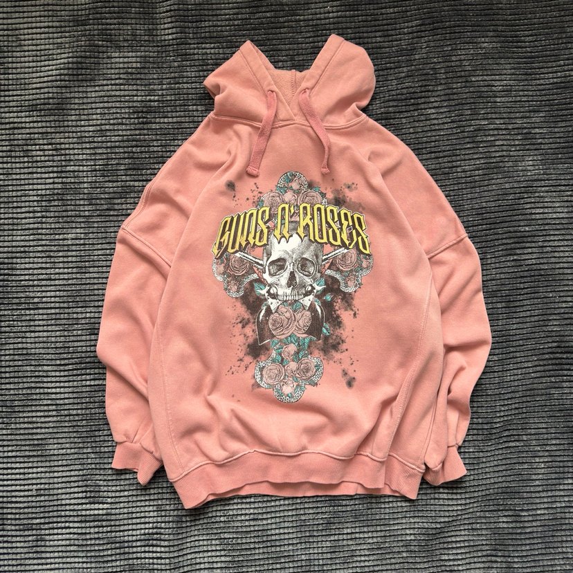 Pembe kapüşonlu sweatshirt, bol kesim ve uzun kollu. Kafatası ve çiçek baskılı, yumuşak ve sıcak kumaştan günlük kullanım için uygun.