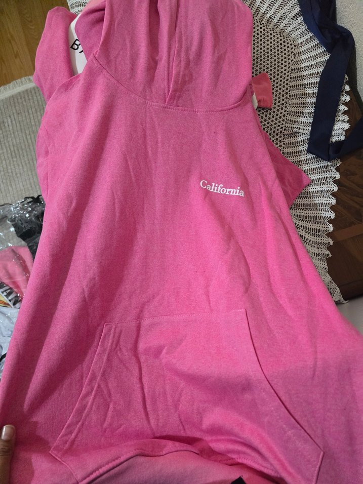 Pamuk kumaştan yapılmış, kapüşonlu ve fermuarlı, pembe kolsuz, vücuda oturan sweatshirt. Normal midi boyda, üzerinde "California" yazısı bulunur. Trendy günlük sokak stili için uygun.