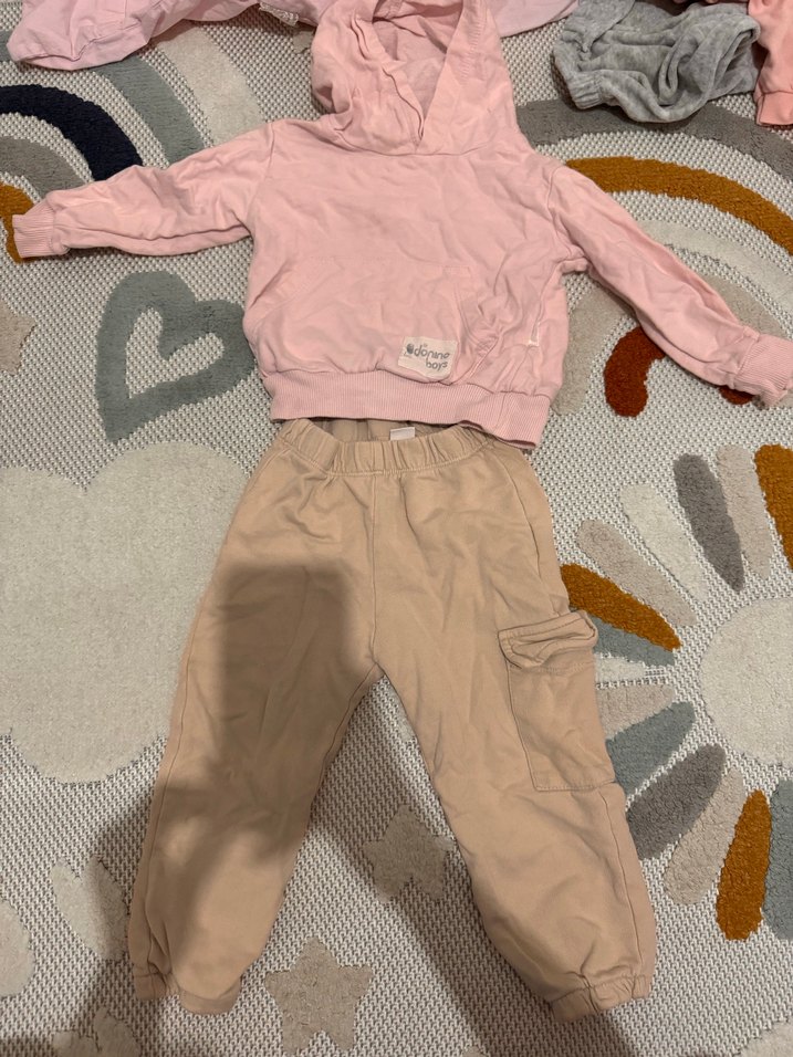 Pastel pembe uzun kollu triko kapüşonlu üst ve cepli bej pantolondan oluşan bebek kız takımı.