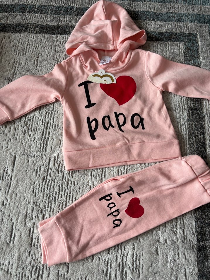 Pembe, kapüşonlu ve uzun kollu örme bebek kıyafet seti, "I ❤️ papa" baskılı. Yumuşak ve rahat kumaştan üretilmiştir.