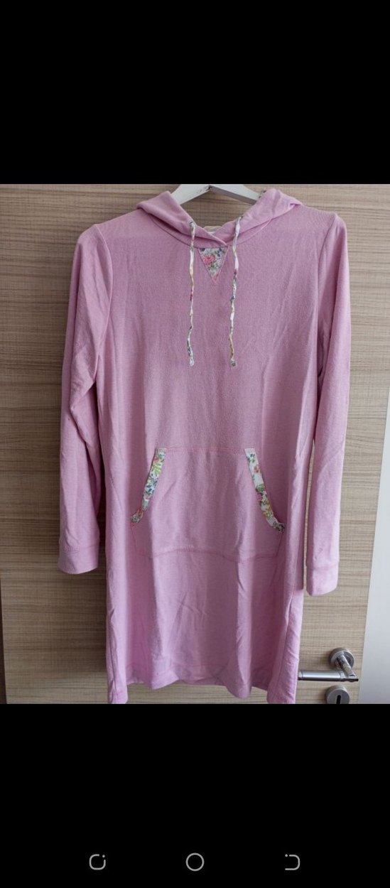 Uzun kollu, kapüşonlu ve bol kesim pembe kadın geceliği, yumuşak kumaştan. Ön ceplerde çiçek desenli detay bulunur.