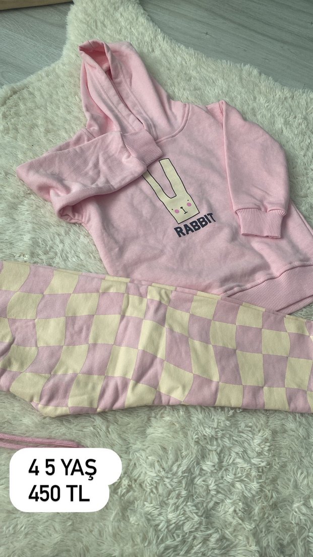 Pastel pembede, tavşan baskılı, uzun kollu kapüşonlu ve kareli pantolonlu örme kız çocuk takımı. 4-5 yaş için uygundur.