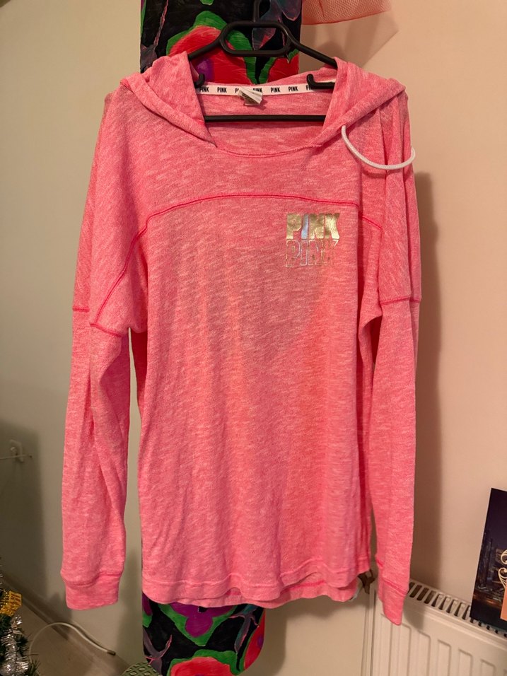 Pembe renkte, uzun kollu ve salaş kesime sahip bu sweatshirt kapüşonlu ve parlak detaylıdır. Göğüste küçük PINK logosu bulunur, günlük kullanım için uygundur.