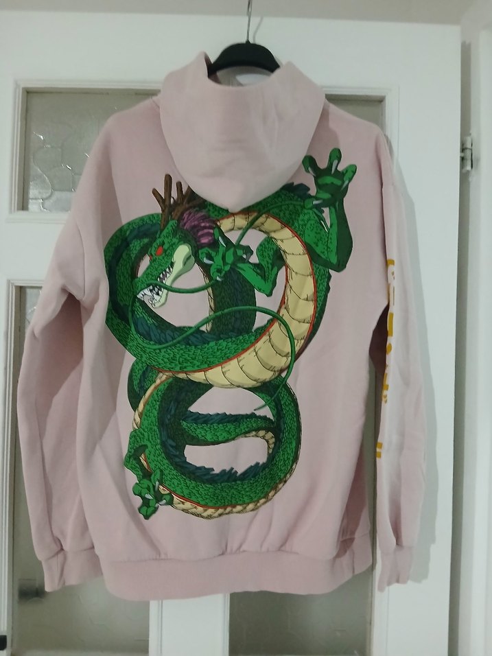 Pembe renkli, bol kesim sweatshirt, önünde fermuarlı, sırtında canlı yeşil ejderha baskısı bulunur. kapisonlu yaka ve uzun kolludur, yumuşak sentetik kumaştan üretilmiştir. renk açık çıktı ama pembe renkte m l uyumlu rengi en sondaki gibi