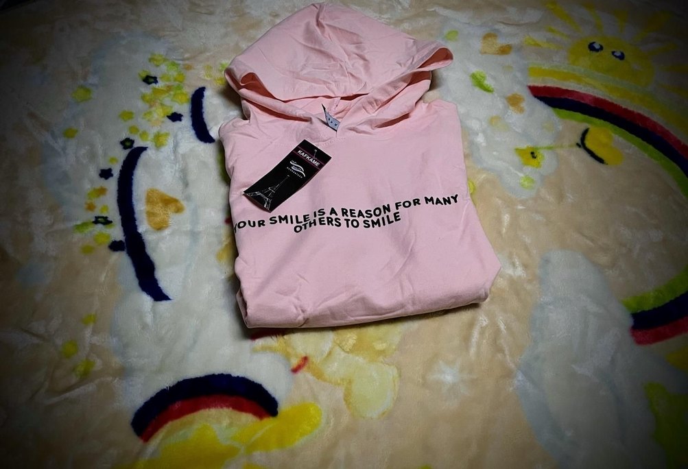 Pastel pembe kapüşonlu sweatshirt, uzun kollu ve bol kesimdir. Yumuşak ve sıcak kumaştan yapılmıştır. Önünde motive edici baskı bulunur. Kumaşı ince