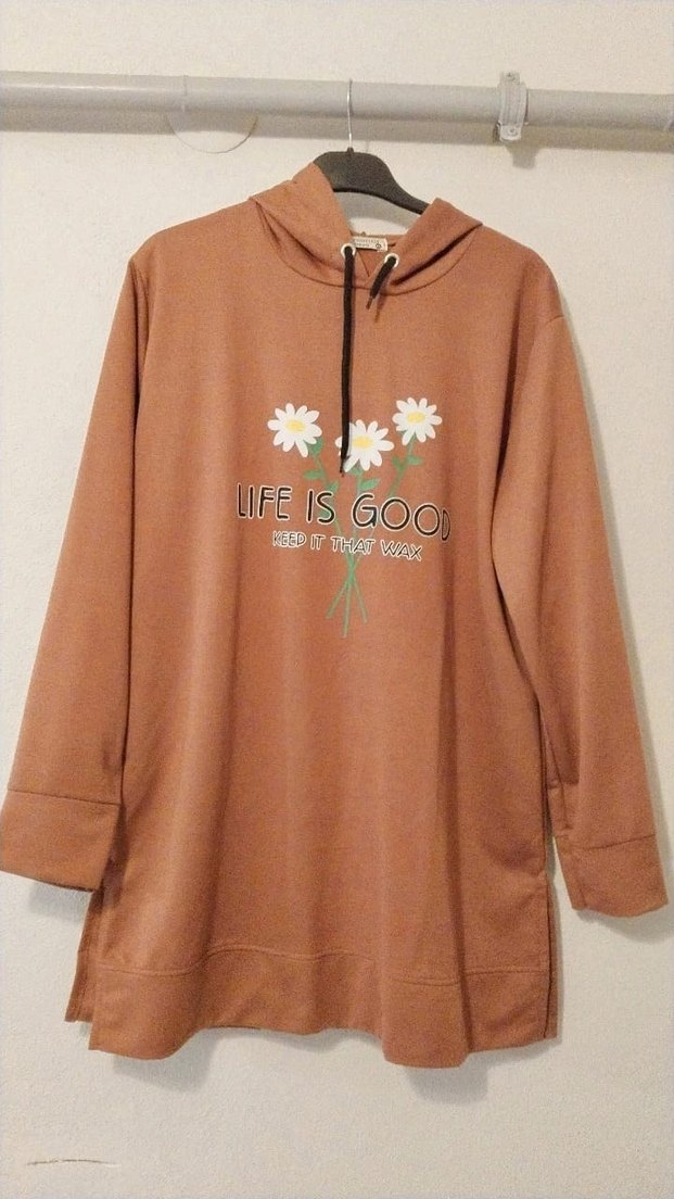 Yumuşak kumaştan, kapüşonlu ve fermuarlı, bol kesim uzun bej sweatshirt. Üzerinde 'Life is Good' yazılı çiçek baskısı bulunur.