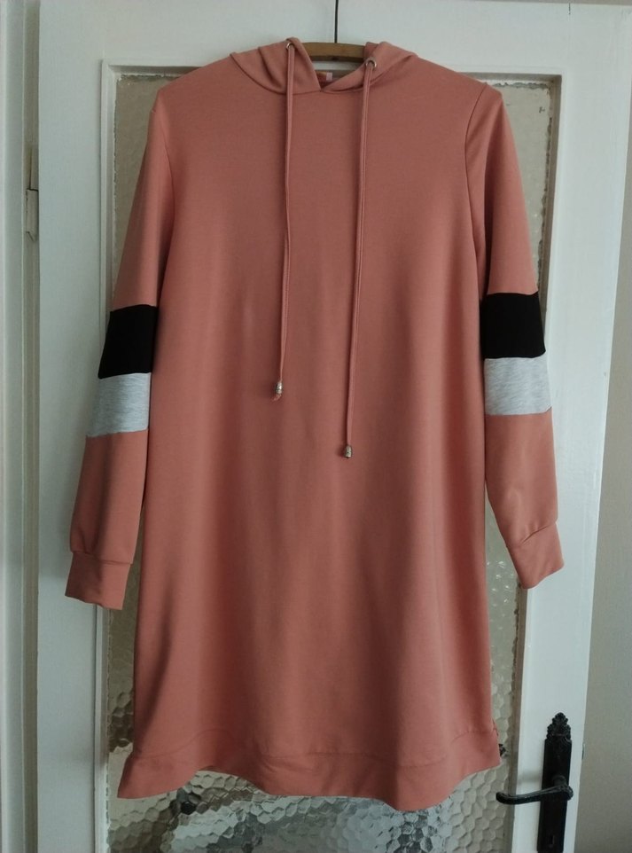 Pembe kapüşonlu, uzun kollu ve kollarında gri-siyah renk blokları olan salaş kesim, dökümlü tunik. rahat hiç bir sorunu yok tertemiz renk yavruağzı