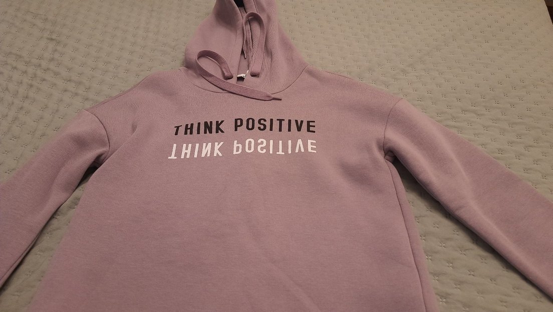 Pembe, kapüşonlu, uzun kollu ve bol kesim sweatshirt. Önünde "THINK POSITIVE" yazısı ve fermuar detayı bulunur. Yumuşak sentetik kumaştan üretilmiştir.