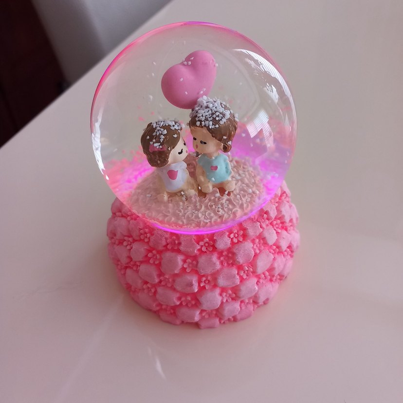 Sevimli bir çift figürinin kalp balon tuttuğu, detaylı çiçek desenli pembe kar küresi. ❄️ isterseniz isigini acarsiniz isterseniz isiksiz kullanabilirsiniz iki renkli