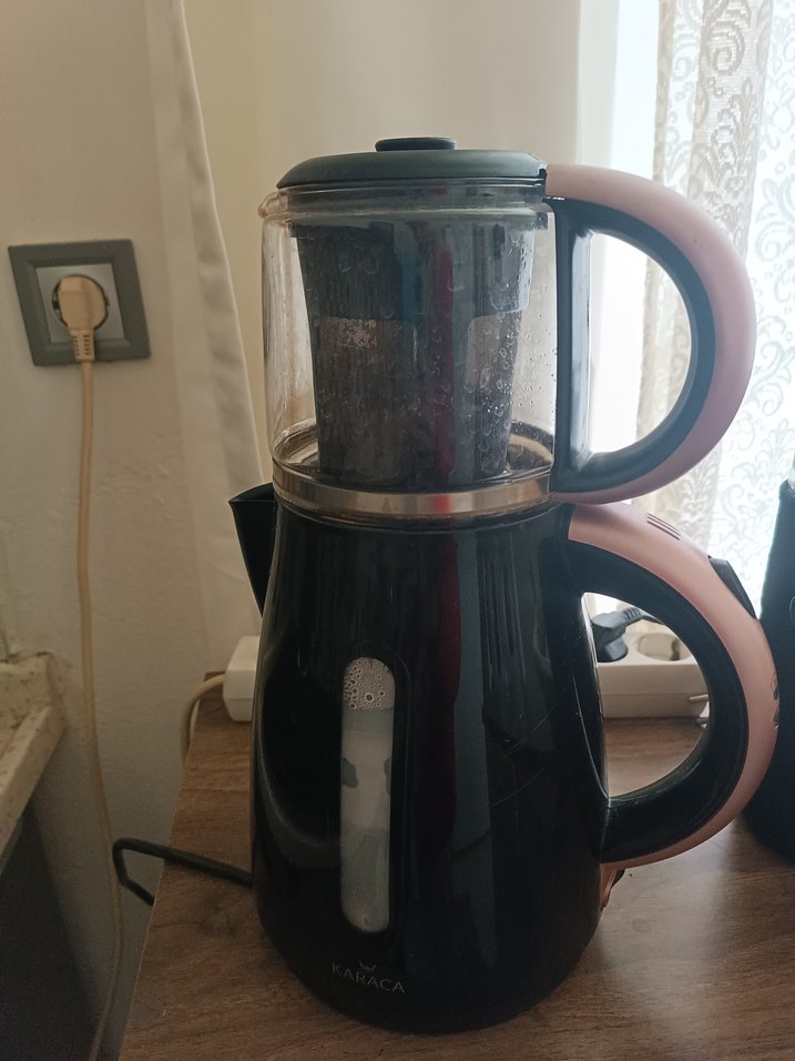 Pembe Karaca çay makinesi, üstünde cam demlik ve demlik filtresi ile birlikte su seviyesi göstergeli koyu taban ve yumuşak tutuşlu ergonomik kulplara sahiptir.