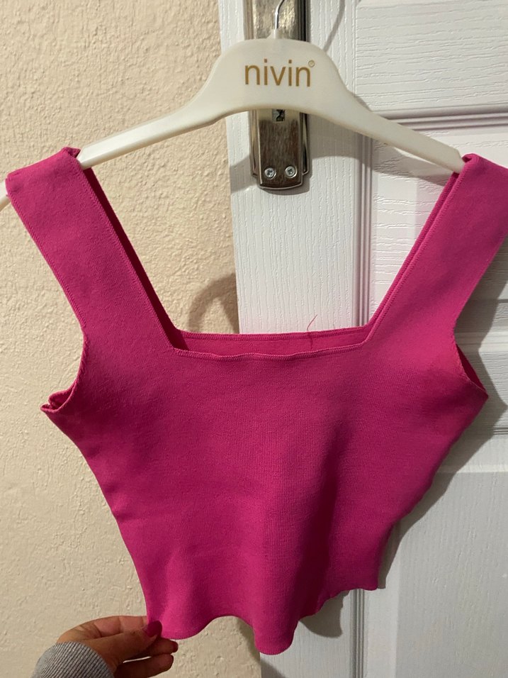 Kare yaka ve kolsuz tasarıma sahip, fit kesim pembe mini kadın atlet.