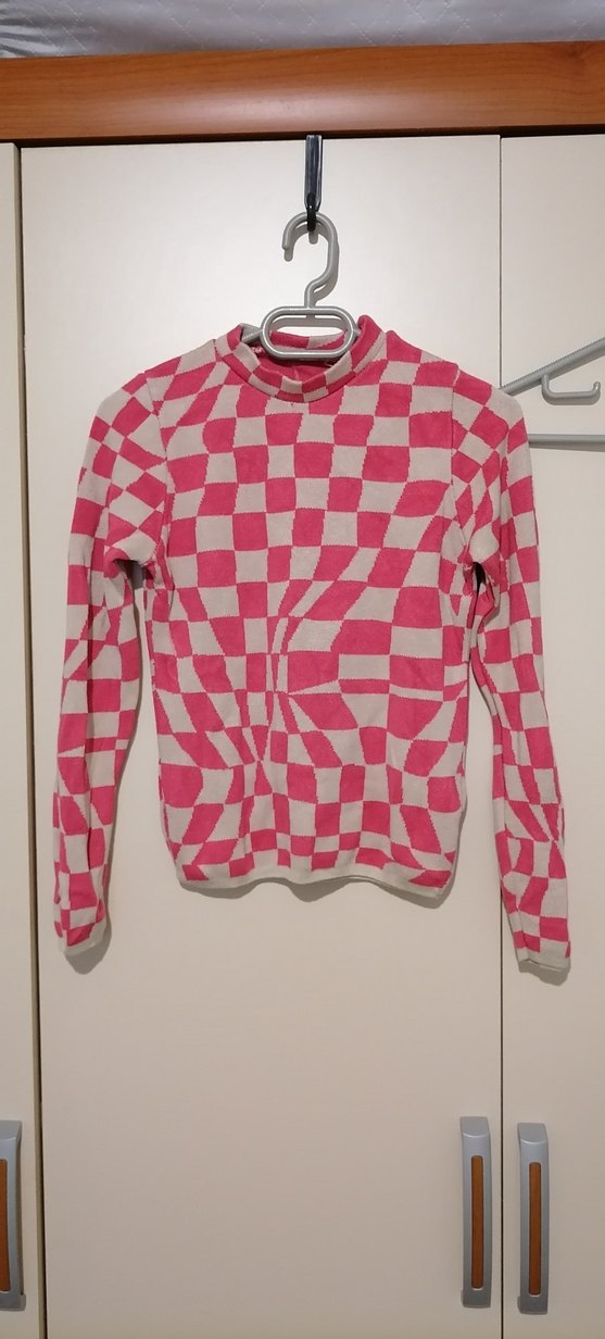 Pembe kareli, boğazlı uzun kollu kadın kazak, yumuşak sentetik kumaştan örülüdür. Normal midi boyda, rahat sokak stiline uygundur.