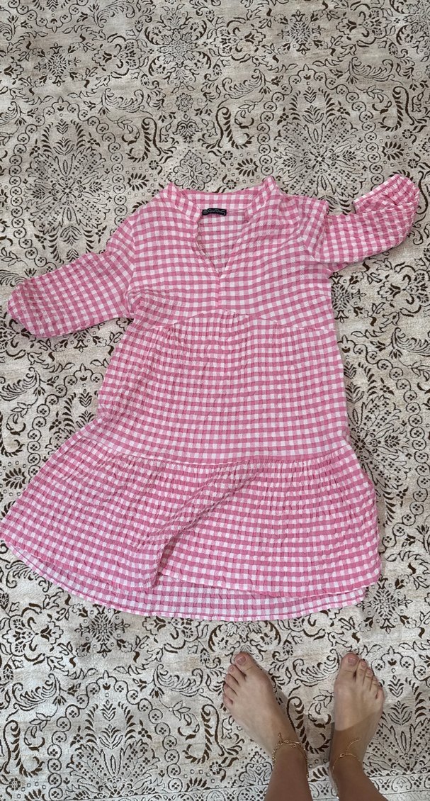 Pembe kareli, uzun kollu, V yakalı, bol kesim midi elbise. Yumuşak keten kumaştan, fırfır detaylı, bohem tarzda rahat bir model.