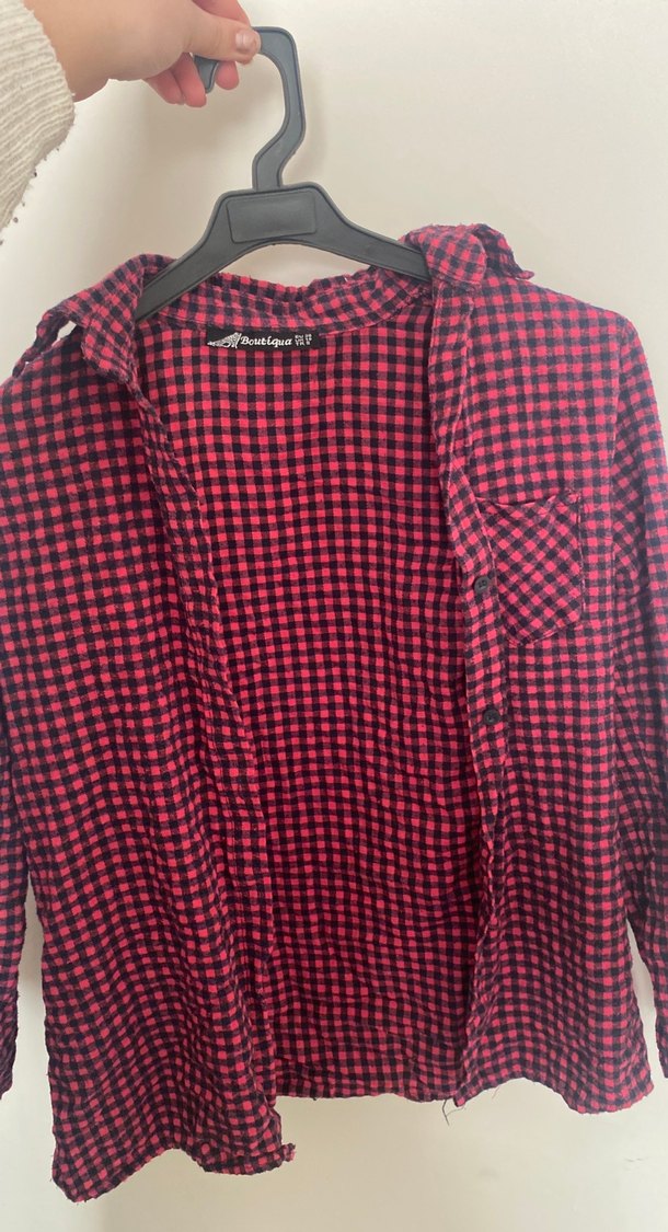 Bordo kareli kadın gömlek, uzun kollu, V yakalı ve bol kesimdir. Yumuşak sentetik kumaştan üretilmiştir. Günlük rahat kullanıma uygundur.