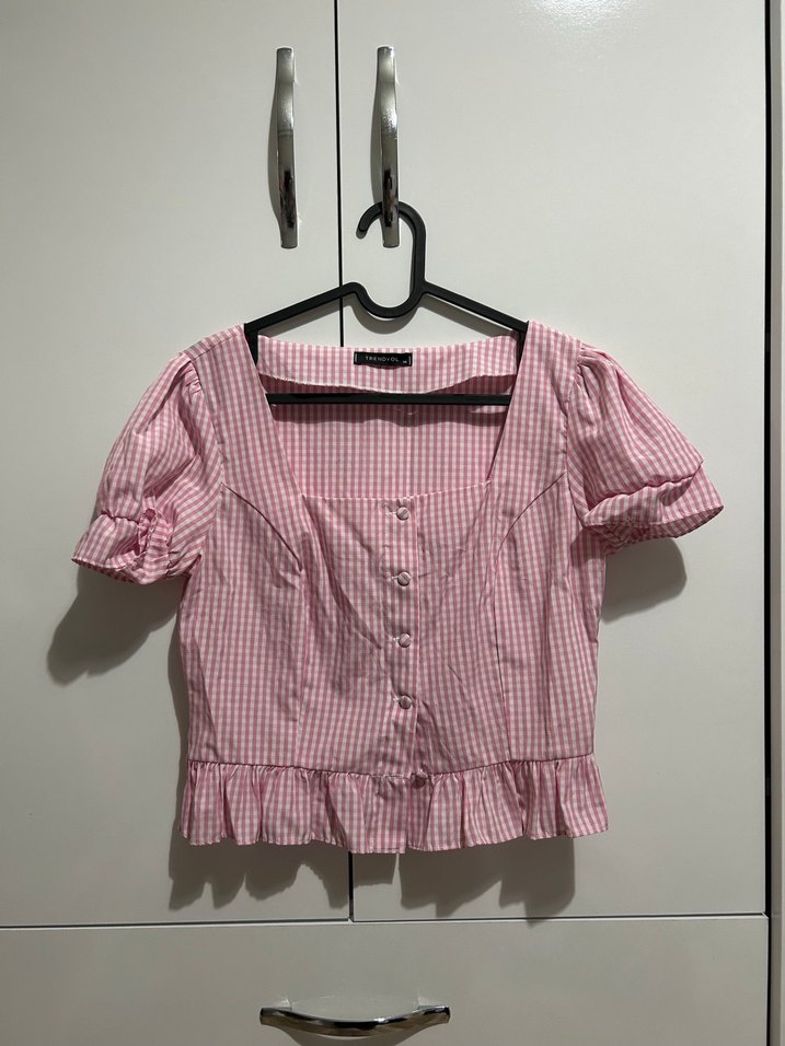Pamuklu, pembe kareli, kısa kollu, düğmeli ve salaş kesim bluz. Kayık yaka ve günlük kullanım için uygun.