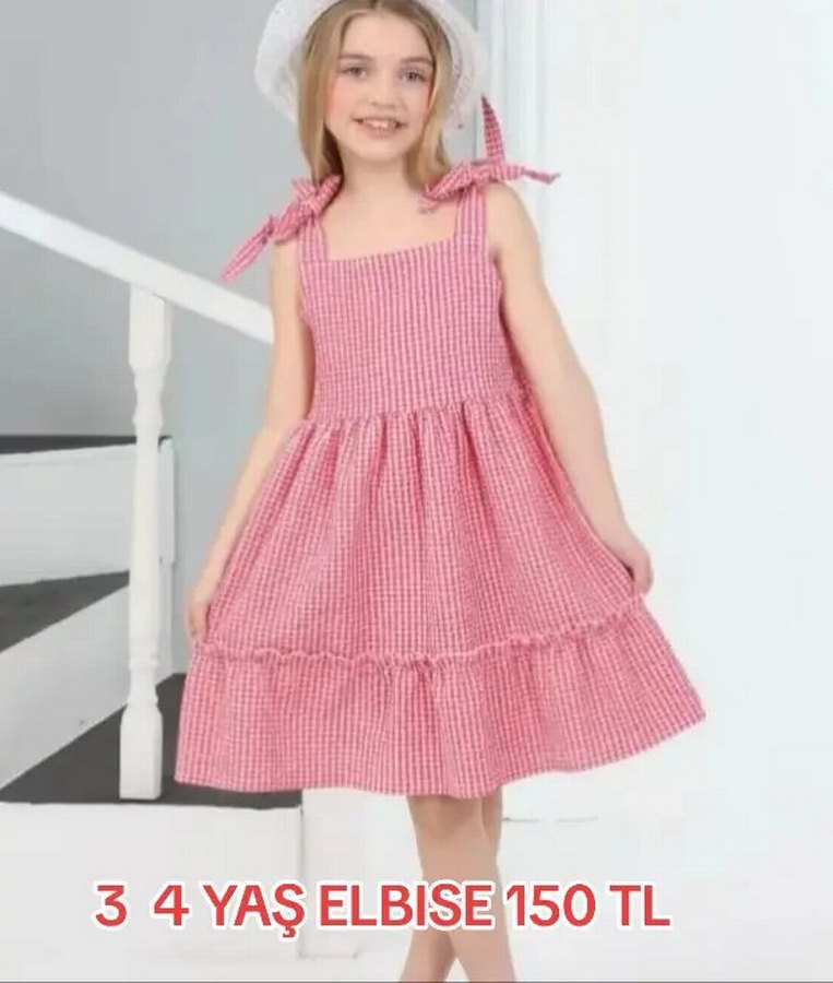 Pembe kareli, askılı ve fırfırlı detaylara sahip, rahat kesim kız elbisesi. Yumuşak sentetik kumaştan üretilmiştir.
