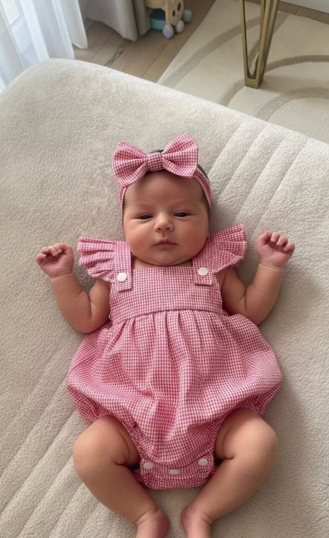 Pembe kareli ve fırfırlı detaylı bebek kız tulumu. Omuzlarda fırfır ve fiyonk detaylı saç bandı ile birlikte. Yumuşak ve rahat kumaş.