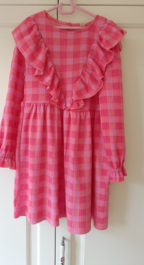 Yumuşak sentetik kumaştan yapılmış, uzun kollu, yuvarlak yakalı, bol kesim pembe kareli kız elbisesi. Fırfır detayları ve bohem-retro tarzı öne çıkar.68 cm uzunluk