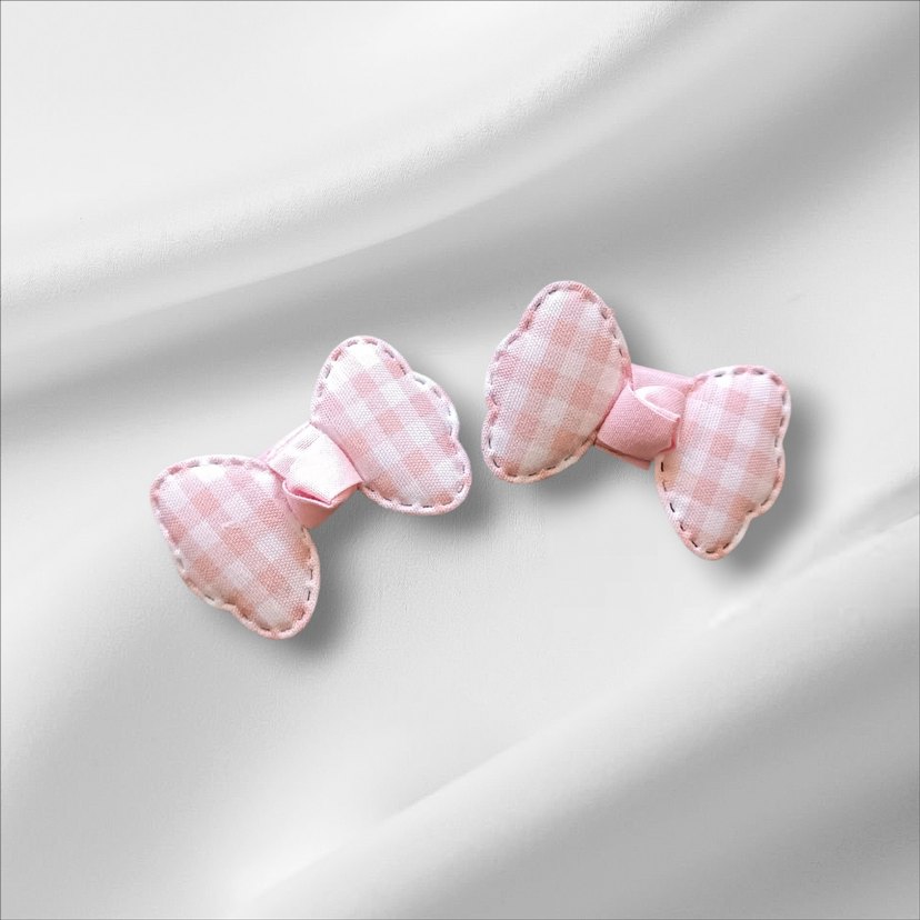 Pastel pembe kareli desenli, fiyonk detaylı klasik tarzda çocuk saç tokaları.