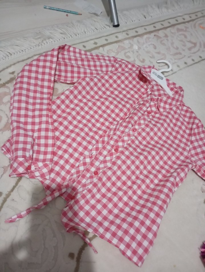 Pamuklu, pembe kareli, düğmeli gömlek Rahat kesimli, halter yaka ve günlük kullanıma uygun.