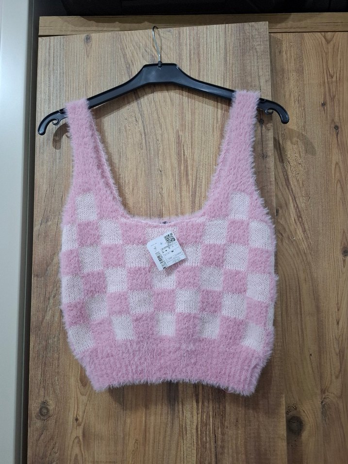 Pembe Kareli Kısa Örgü Süveter