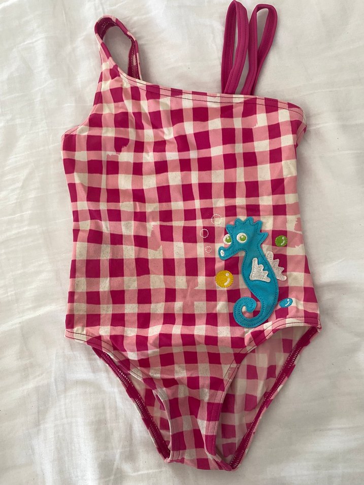 Pembe kareli mayo, ince askılı ve renkli denizatı işlemeli, plaj için uygun. Ölçüleri fotoğraflarda mevcut