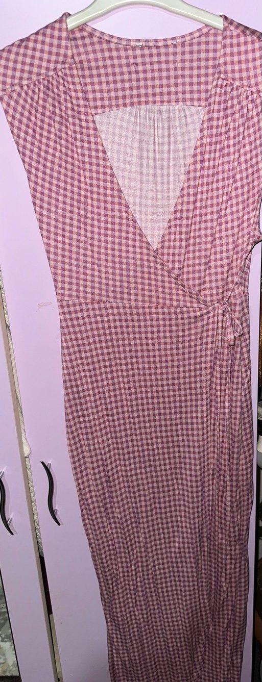 Pembe kareli, drapeli midi boy, v yaka ve kolsuz, rahat sentetik kumaştan yapılmış, bohem tarzda dar kesim elbise. MUH TE ŞEM bir elbise ister yazın ister gebelik olarak mükemmel.. terletmeyen bir kumaşı sevimli bir rengi var yine hiç kullanılmadı :)